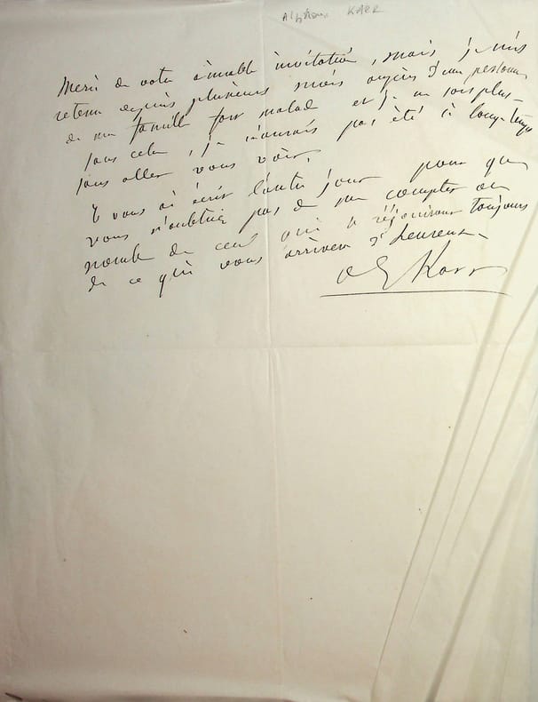 Alphonse Karr (1808-1890), écrivain, journaliste. L.A.S., sd, œp in-4. « Merci de votre aimable invitation, mais je suis retenu depuis plusieurs mois auprès d'une personne de ma famille fort malade et je ne sors plus. Sans cela, je n'aurais pas été si longtemps sans aller vous voir. Je vous ai écrit l'autre jour pour que vous n'oubliez pas de me compter au nombre de ceux qui se réjouissent toujours de ce qui vous arrivera d'heureux. Al Karr ». [133]