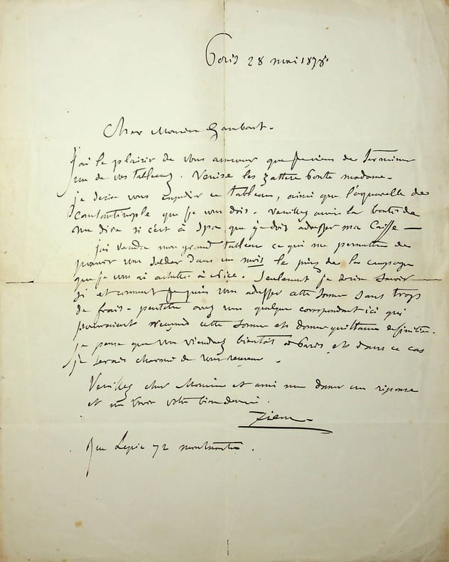 Félix Ziem (1821-1911), peintre proche de l'école de Barbizon, précurseur de l'impressionnisme. L.A.S., Paris, 28 mai 1878, 1p in-4. Au marchand et collectionneur Ernest Gambart (1814-1902). « Cher Monsieur Gambart, J'ai le plaisir de vous annoncer que je viens de terminer un de vos tableaux. Venise Les Zattere Ponte Madone. Je désire vous expédier ce tableau, ainsi que l'aquarelle de Constantinople que je vous dois. Veuillez avoir la bonté de me dire si c'est à Spa que je dois adresser ma caisse. J'ai vendu mon grand tableau, ce qui me permettra de pouvoir vous solder dans un mois le prix de la campagne que je vous ai achetée à Nice. Seulement je dois savoir si et comment je puis vous adresser cette somme sans trop de frais. Peut-être avez-vous quelques correspondants ici qui pourraient recevoir cette comme et donner quittance définitive. Je pense que vous viendrez bientôt à Paris et dans ce cas, je serai charmé de vous recevoir. Veuillez, cher Monsieur et ami, me donner une réponse et me croire votre bien dévoué Ziem rue Lepic 72 Montmartre ». Petites déchirures aux plis et près des plis. Un seul mot touché par une déchirure (« savoir »). Belle lettre autour de ses activités. [133]