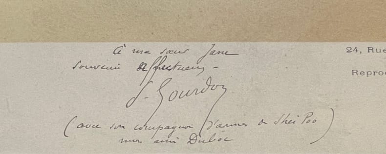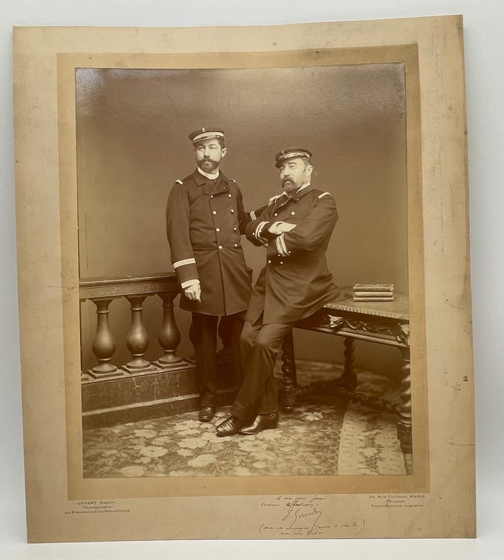 Palma Gourdon (1843-1913), polytechnicien, amiral, héros dans le combat de Shipu. Photographie originale dédicacée, 283*228 mm sur carton 355*310 mm. Photographie représentant Palma Gourdon, à droite, et Émile Duboc (1852-1935), les deux héros du combat de Shipu. Elle est prise par Appert à Paris. Elle porte la dédicace : « à ma soeur Jane / souvenir affectueux / P Gourdon / (avec mon compagnon d'armes de Shei Poo / mon ami Duboc) ». En janvier 1885, lors de la guerre franco-chinoise de 1883-1885, alors que la flotte chinoise avait été en grande partie détruite par l'amiral Amédée Courbet, les cinq grands bateaux restant mouillaient à Shanghai et tentèrent de s'enfuir. Ils furent poursuivis par les français. Les trois croiseurs chinois, trop rapides, réussirent mais les deux frégates durent se réfugier dans la baie de Shipu où l'artillerie les protégea. Dans la nuit du 14 au 15 février, deux canots à vapeur, menés par Palma Gourdon et Emile Duboc, s'engagèrent dans la baie et envoyèrent des torpilles sur l'une des deux frégates, la Yuyuan, qui répliqua sans toucher les assaillants mais en touchant l'autre frégate, la Chengqing. Les frégates chinoises furent coulées tandis que les français purent partir avec un seul mort à déplorer. Très bel état, légèrement salie. Rare document. [III]