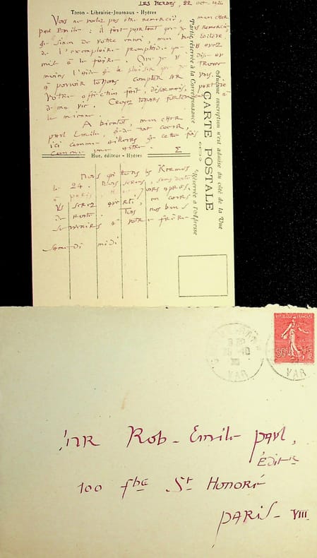 André Suarès (1868-1948), poète, écrivain. L.A.S. « ? » + enveloppe, Les Kermès [Carqueiranne, Var], 22 octobre 1926, 1p in-12. A « Rob-Emile Paul », i.e. Robert Paul, éditeur sous le nom d'Emile-Paul frères. Au dos d'une carte postale de Carqueiranne. « Vous ne voulez pas être remercié, mon cher Paul Emile : il faut pourtant que je vs remercie, & sinon de votre envoi, mon bon éditeur, de l'exemplaire - promptitude - que vs avez mis à la [mot illisible]. Que je vs dise au moins l'aide & le plaisir que je trouve à pouvoir toujours compter sur vous. Votre affection fait, désormais, partie de ma vie. Croyez toujours fortement à la mienne. A bientôt, mon cher Paul Emile, & de tout coeur, ici comme ailleurs & cette fois comme un astre. ? Nous quittons les Kermès le 24. Nous serons, sans doute, à Paris, huit jours après. Vs serez averti, en cours de route. Tous nos bons souvenirs à votre frère ». Joli courrier amical à son éditeur. [109]