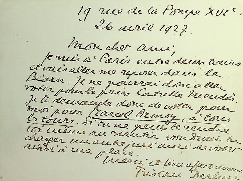 Tristan Derème (1889-1941), poète. L.A.S., 26 avril 1927, 1p in-12. A l'écrivain Léo Poldès (1891-1970), militant socialiste puis communiste, fondateur du Club du Faubourg. « Mon cher ami, Je suis à Paris entre deux trains et vais aller me reposer dans le Béarn. Je ne pourrai donc aller voter pour le prix Catulle Mendès. Je te demande donc de voter pour moi pour Marcel Ormoy, à tous les tours. Si tu ne peux te rendre toi-même au scrutin, voudrais-tu charger un autre juré ami de voter ainsi à ma place. Merci et bien affectueusement. Tristan Derême ». Nous n'avons pas trouvé quel fut, en 1927, le lauréat de ce prix, créé par Jane Catulle-Mendès. [109]
