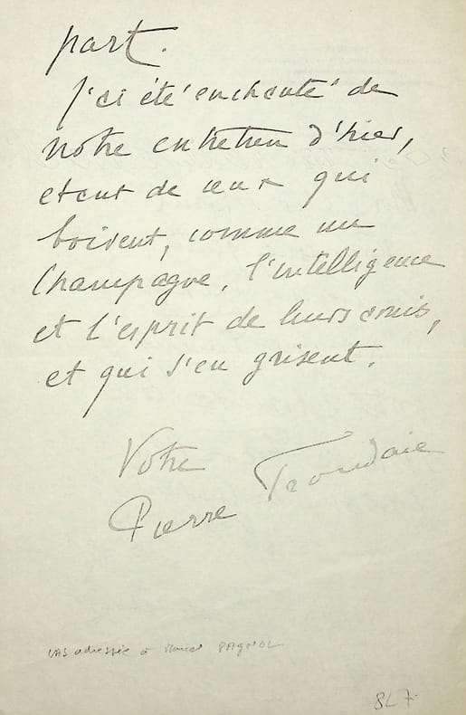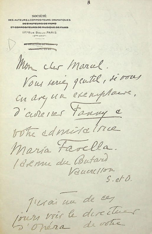 Pierre Frondaie (1884-1948), poète, écrivain. L.A.S., sd [1931], 2p in-8. A l'écrivain Marcel Pagnol (1895-1974) : « Mon cher Marcel, Vous seriez gentil, si vous en avez un exemplaire, d'adresser Fanny à votre admiratrice Maria Favella, 1 avenue du Butard, Vaucresson S. et O. J'irai un de ces jours voir le directeur d'opéra de votre part. J'ai été enchanté de notre entretien d'hier, étant de ceux qui boivent, comme un champagne, l'intelligence et l'esprit de leurs amis et qui s'en grisent. Votre Pierre Frondaie ». Sympathique lettre. [132]