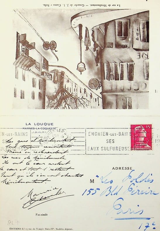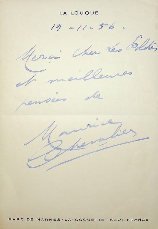 Maurice Chevalier (1888-1972), chanteur, écrivain, fameux artiste. L.A.S., 19 novembre 1956, 1p in-8. A l'écrivain, militant socialiste puis communiste, fondateur du Club du Faubourg, Léo Poldès (1891-1970). « Merci cher Léo Poldès et meilleures pensées de Maurice Chevalier ». Courrier écrit sur une carte lettre. Au dos, une reproduction de la rue de Ménilmontant par J.L. Castro e Solla et un fac-simile du texte de la marche de Ménilmontant. Cette carte a été éditée pour Maurice Chevalier. Joli document. [133]