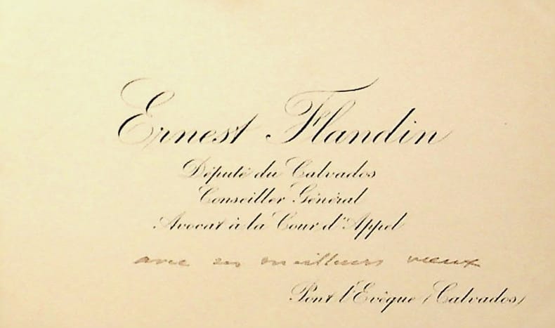 Ernest Flandin (1868-1943), homme politique, député du Calvados. C.A., sd, 1 ligne. « Avec ses meilleurs voeux ». [107]