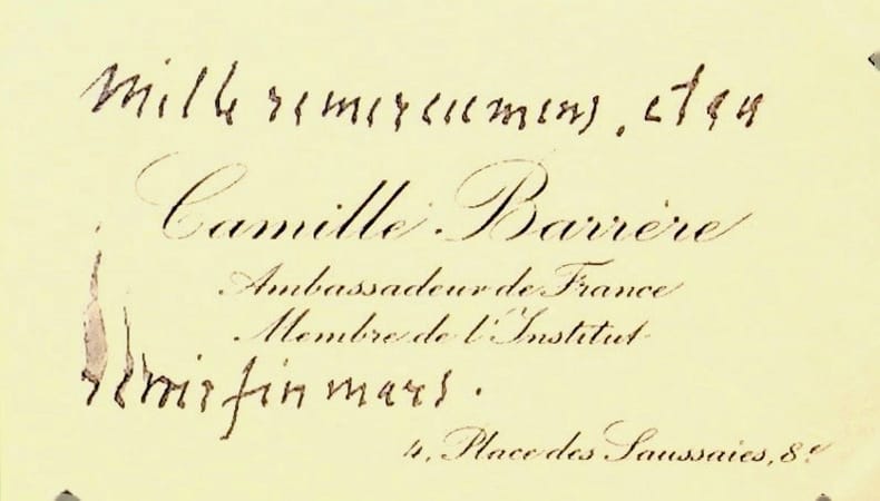 Camille Barrère (1851-1940), diplomate. C.A., sd, 2 lignes. « Mille remerciemens et au revoir fin mars ». [107]