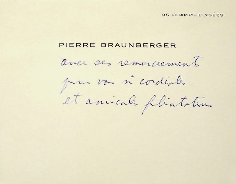 Pierre Braunberger (1905-1990), producteur de cinéma. C.A., sd, 3 lignes. « Avec ses remerciements pour vos si cordiales et amicales félicitations ». [107]