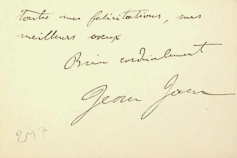 Jean-Jam (?-1951), chansonnier, écrivain. C.A.S., R°V°, sd. « Cher Ami, Rentrant de la campagne (où j'avais fui la fête de la gueuse et l'ivrognerie du peuple. souverain ?), je trouve le faire-part de ton mariage, accepte donc avec toutes mes félicitations, mes meilleurs voeux. Bien cordialement. Jean Jam ». [107]