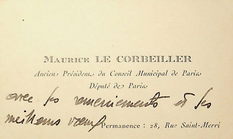 [Jean] Maurice Le Corbeiller (1859-1936), homme politique, député. C.A., sd, 2 lignes. « Avec ses remerciements et ses meilleurs voeux ». [107]