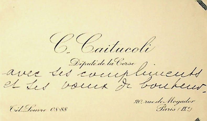 Célestin Caïtucoli (1865-1935), homme politique, député de Corse. C.A., sd, 2 lignes. « Avec ses compliments et ses voeux de bonheur ». [107]