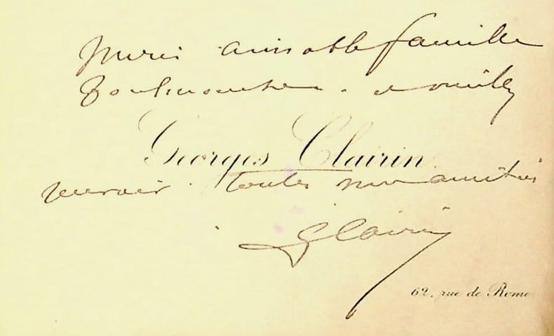 Georges Clairin (1843-1919), peintre, illustrateur. C.A.S., sd, 3 lignes. « Merci aimable famille [mot illisible] et veuillez recevoir toute mon amitié. GClairin ». [107]