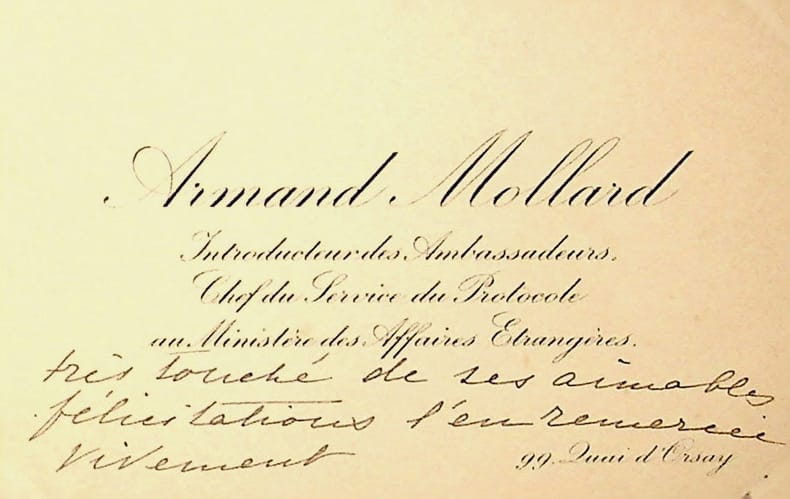 Armand Mollard (1862-1930), diplomate, ambassadeur au Luxembourg. C.A., sd, 3 lignes. « Très touché de ses aimables félicitations l'en remercie vivement ». [107]