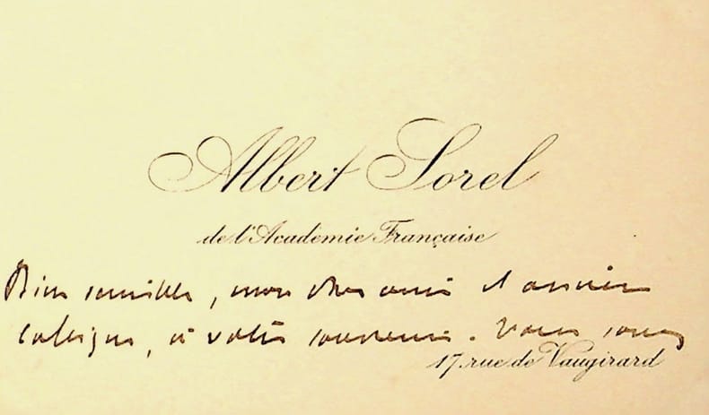 Albert Sorel (1842-1906), historien, membre de l'Académie française. C.A.S., sd, 4 lignes. « Bien sensible, mon cher ami, d'avoir [mot illisible] à votre souvenir. Vous savez que tel était mon désir exprimé depuis longtemps déjà. AS ». [107]
