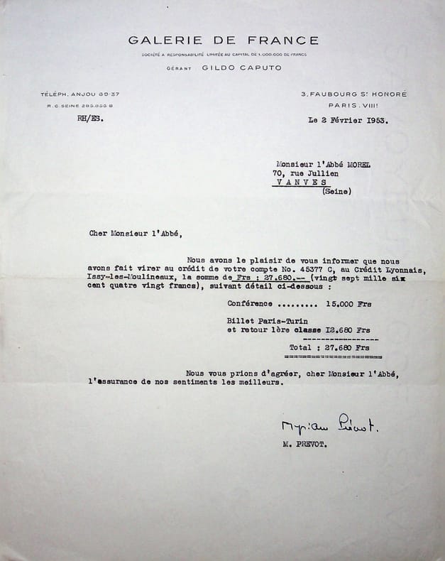 Myriam Prévot (1923-1977), galeriste. L.S., 2 février 1953, 1p in-4. A l'abbé et peintre Maurice Morel (1908-1991). Elle lui indique l'envoi d'un virement en paiement d'une conférence à Turin. [108-2]
