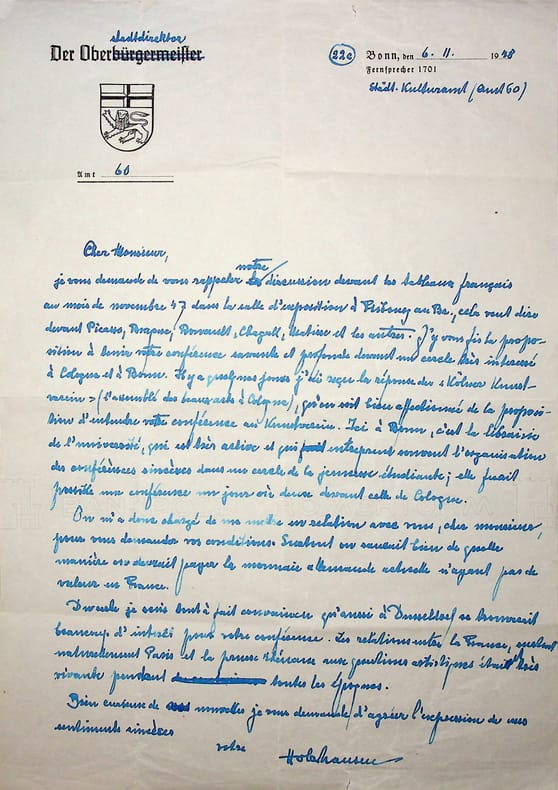 Peter Stockhausen (1898-1961), homme politique, maire de Bonn. L.A.S., Bonn, 6 novembre 1948, 1p in-4. A l'abbé et peintre Maurice Morel (1908-1991), en français. Longue lettre à propos d'un projet de conférences de Morel à Cologne et Bonn. Il rappelle leur rencontre à Fribourg dans une exposition présentant des oeuvres de « Picasso, Braque, Rouault, Chagall, Matisse et les autres ». [108-2]