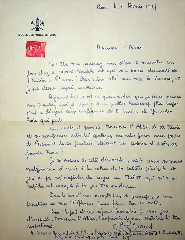 André Giraud (1925-1997), polytechnicien, haut fonctionnaire, homme politique, ministre. L.A.S., Paris, 2 février 1948, 1p in-4. A l'abbé et peintre Maurice Morel (1908-1991). Giraud ayant été initié à Picasso par Morel, il lui demande faire une conférence sur « Picasso et sa peinture devant un public d'élèves des grandes écoles ». Rare lettre du jeune Giraud qui fera une grande carrière. [108-2]