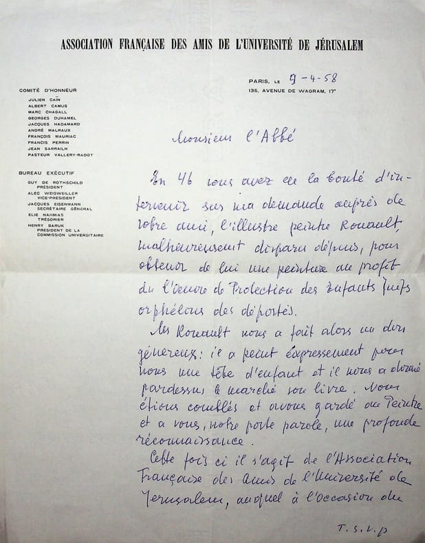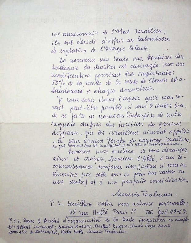 Moussia Toulman (1903-1997), peintre ukrainienne. L.A.S., Paris, 9 avril 1958, 2p in-4. A l'abbé et peintre Maurice Morel (1908-1991). Belle et longue lettre qui, après avoir rappelé les dons de Georges Rouault, ami de Morel, pour une vente de charité en 1946, demande si Morel peut intervenir auprès des héritiers de Rouault afin d'obtenir une oeuvre pour une vente aux enchères à l'occasion des 10 ans d'Israël, rappelant que les Israéliens disent de Rouault qu'il est « le plus grand peintre du paysage israélien ». [108-2]