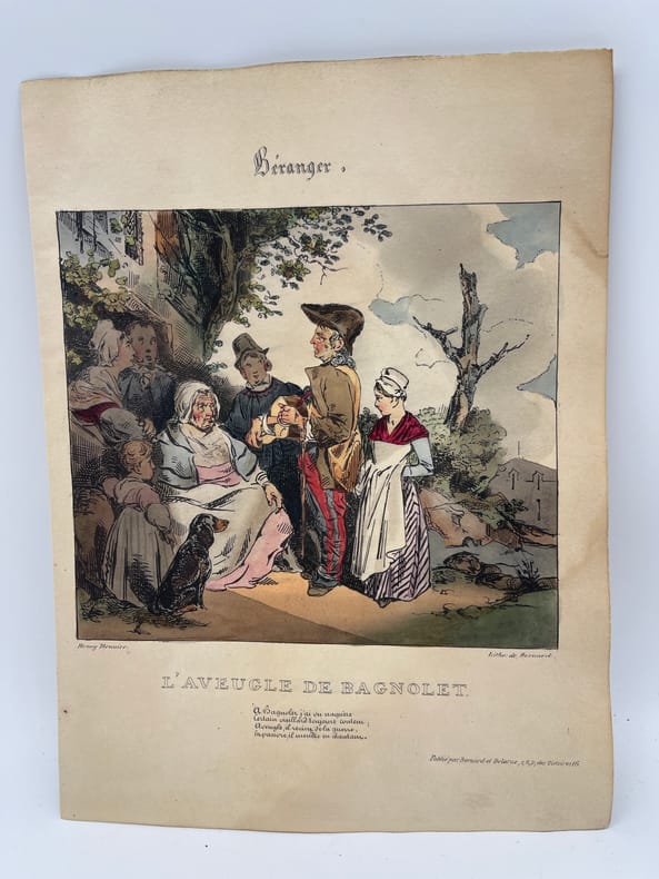 Henry Monnier, Lithographie d'après les chansons de Pierre-Jean de Béranger. [Paris, Bernard et Delarüe, 1828]. Environ 220*165mm. Belle lithographie aquarellée à l'époque. Illustration pour le poème « L'Aveugle de Bagnolet ». Papier jauni, mouillé. La lithographie reste toutefois jolie. [159]