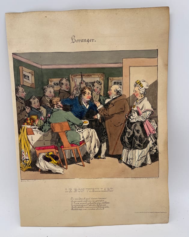 Henry Monnier, Lithographie d'après les chansons de Pierre-Jean de Béranger. [Paris, Bernard et Delarüe, 1828]. Environ 220*165mm. Belle lithographie aquarellée à l'époque. Illustration pour le poème « Le bon Vieillard ». Papier jauni, mouillé. La lithographie reste toutefois jolie. [159]