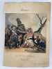 Henry Monnier, Lithographie d'après les chansons de Pierre-Jean de Béranger. [Paris, Bernard et Delarüe, 1828]. Environ 220*165mm. Belle lithographie aquarellée à l'époque. Illustration pour le poème « La Vivandière ». Papier jauni, mouillé. La lithographie reste toutefois jolie. [159]