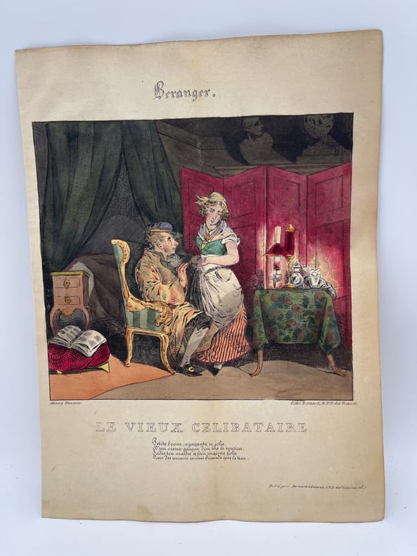 Henry Monnier, Lithographie d'après les chansons de Pierre-Jean de Béranger. [Paris, Bernard et Delarüe, 1828]. Environ 220*165mm. Belle lithographie aquarellée à l'époque. Illustration pour le poème « Le vieux Célibataire ». Papier jauni, mouillé. La lithographie reste toutefois jolie. [159]