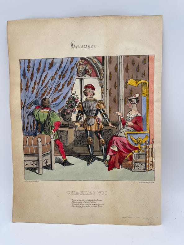 Henry Monnier, Lithographie d'après les chansons de Pierre-Jean de Béranger. [Paris, Bernard et Delarüe, 1828]. Environ 220*165mm. Belle lithographie aquarellée à l'époque. Illustration pour le poème « Charles VII ». Papier jauni, mouillé. La lithographie reste toutefois jolie. [159]