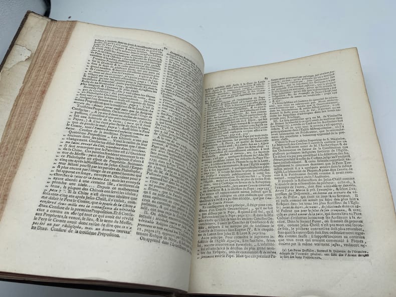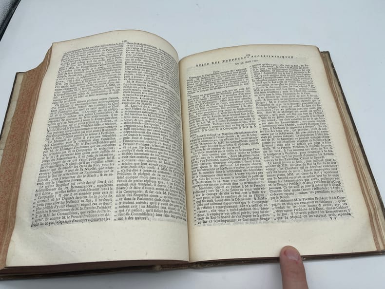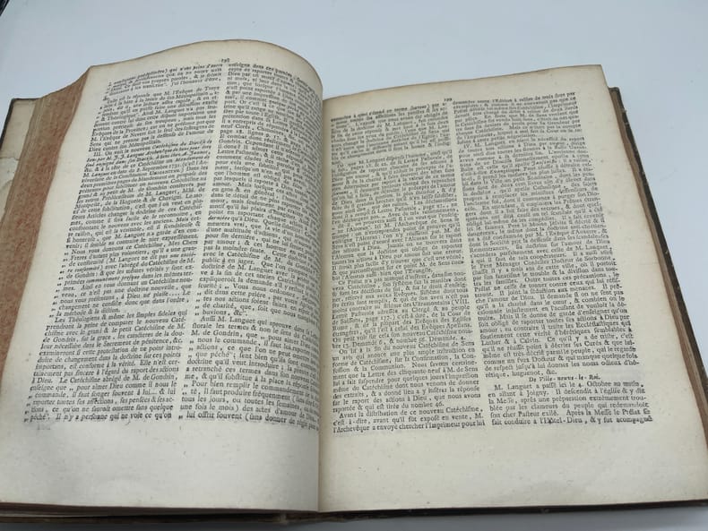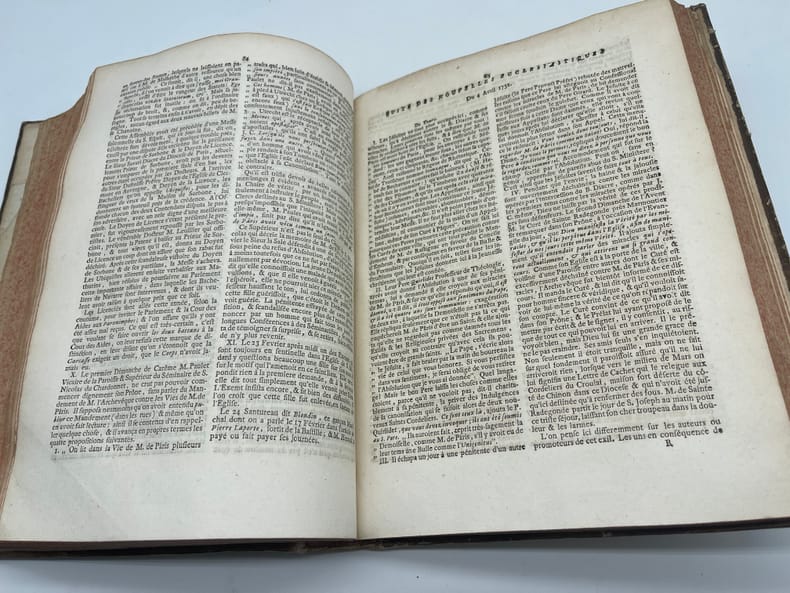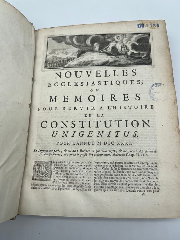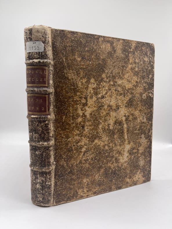 [Jansénisme] Nouvelles ecclésiastiques ou mémoires pour servir à l'histoire de la Constitution Unigenitus pour l'année M.DCC.XXXI. [et] M.DCC.XXXII. Paris, s.n., 1731-1732. In-4, 280-252-XIIp. Deux années complètes de cet important journal publié clandestinement à partir de 1728 et jusqu'en 1803, farouchement militant pour les jansénistes et contre les partisans de la Bulle Unigenitus. Ex-libris « Caroli Du Ruisseau in supremo senatu Patroni », Charles du Ruisseau, avocat au parlement de Paris en 1735 (base AFCEL D1915). Plein papier d'époque, dos à nerfs, pièces de titre, tranches rouges. Papier parfois un peu usé, reliure parfaitement solide. Etiquette sur le dos, cachet sur la première page, répété p.100 (petit séminaire de Caen). Quelques rares feuillets avec petit manque de papier marginal.