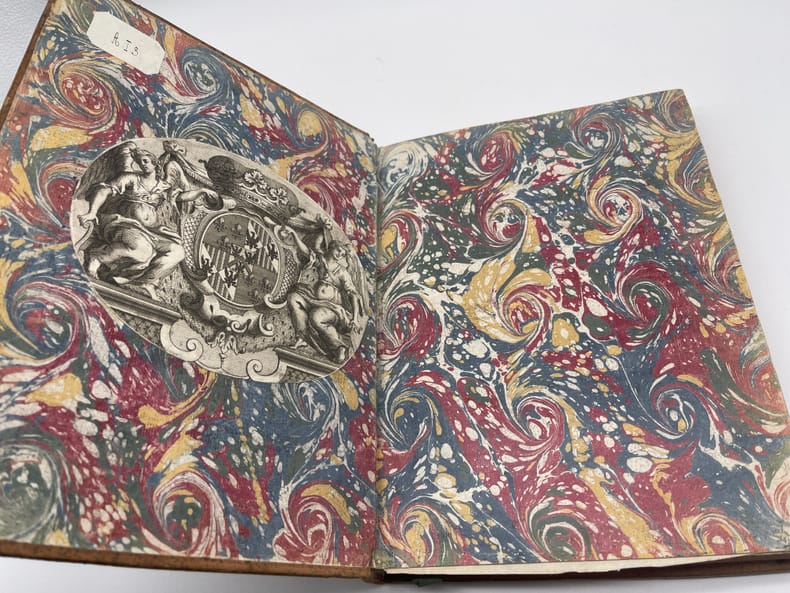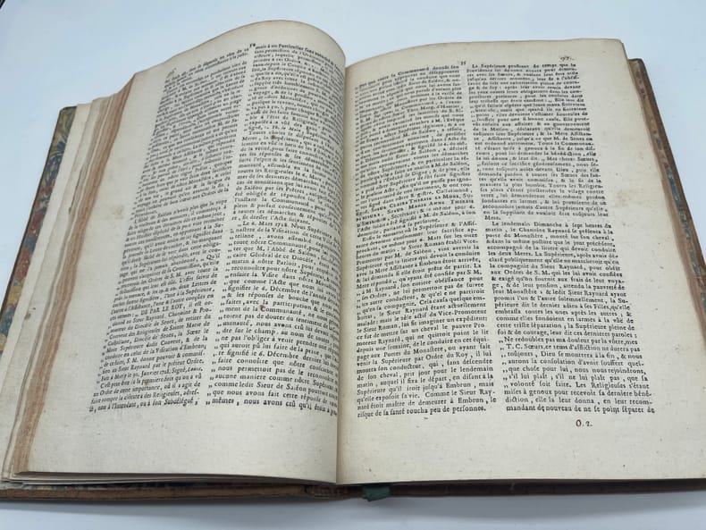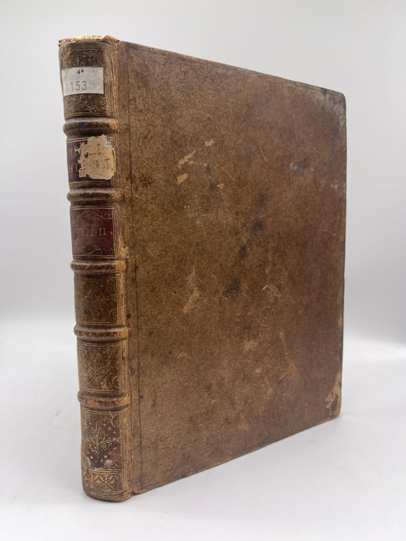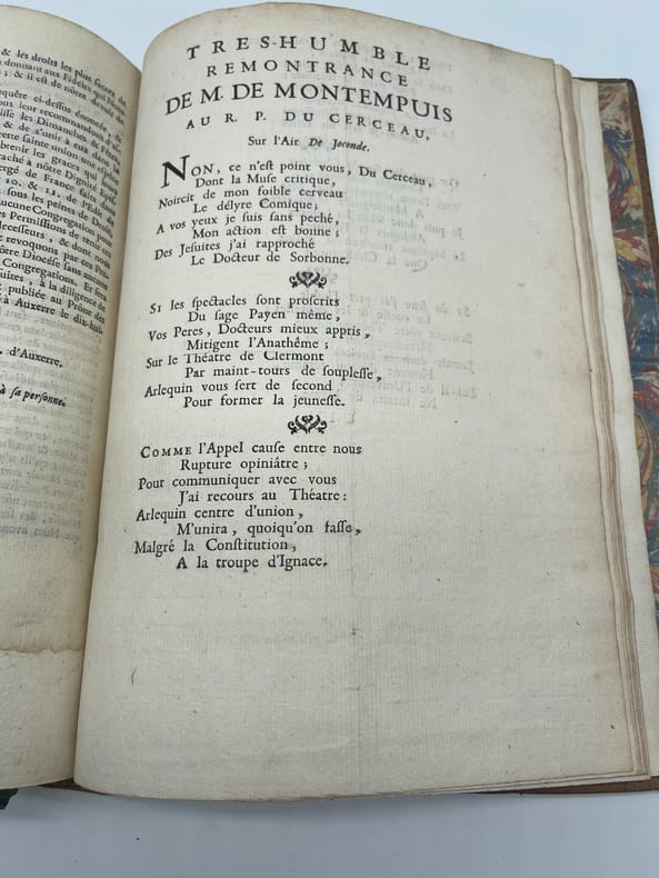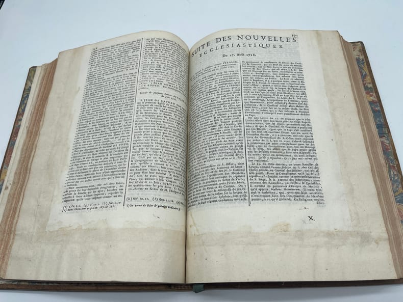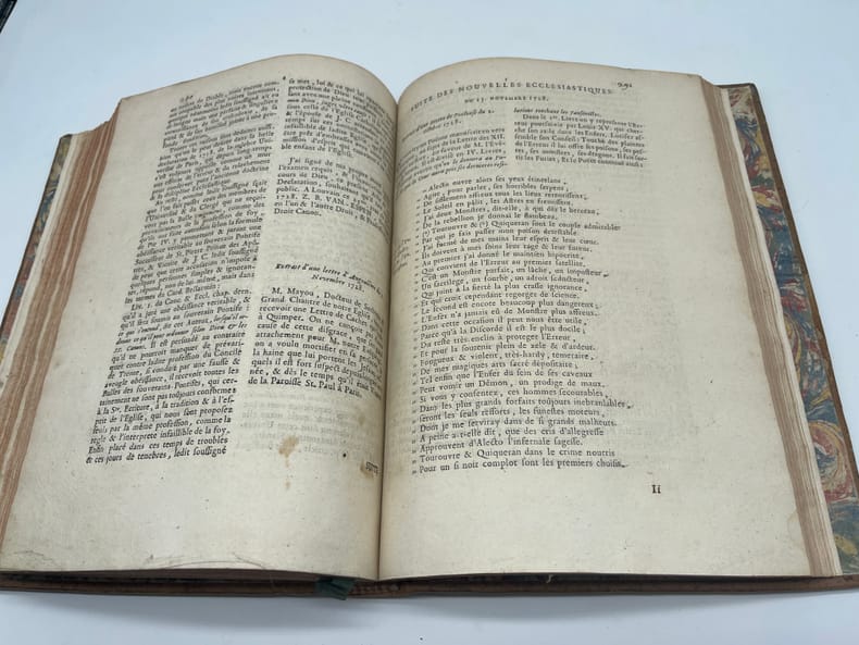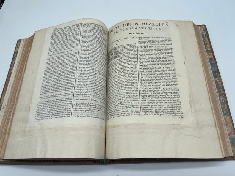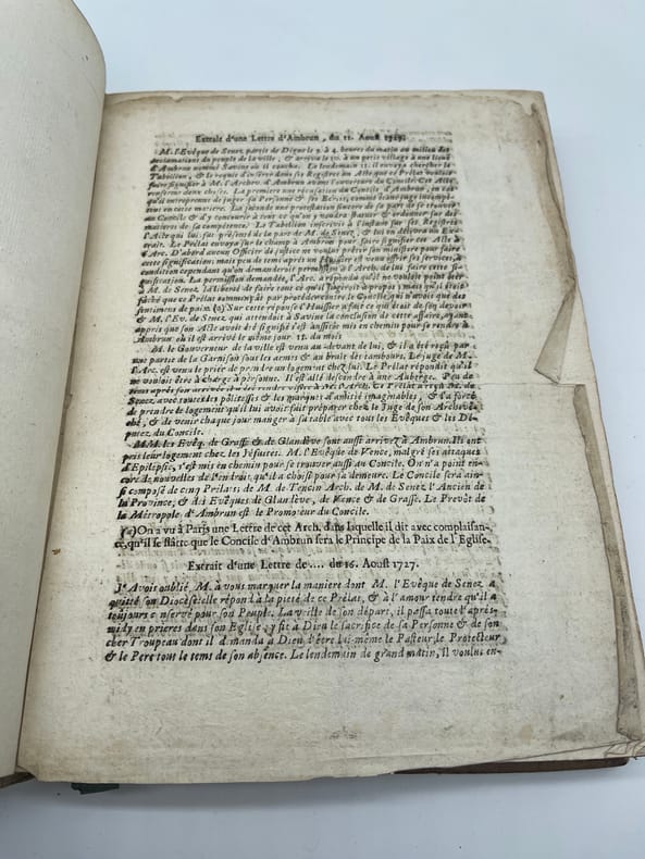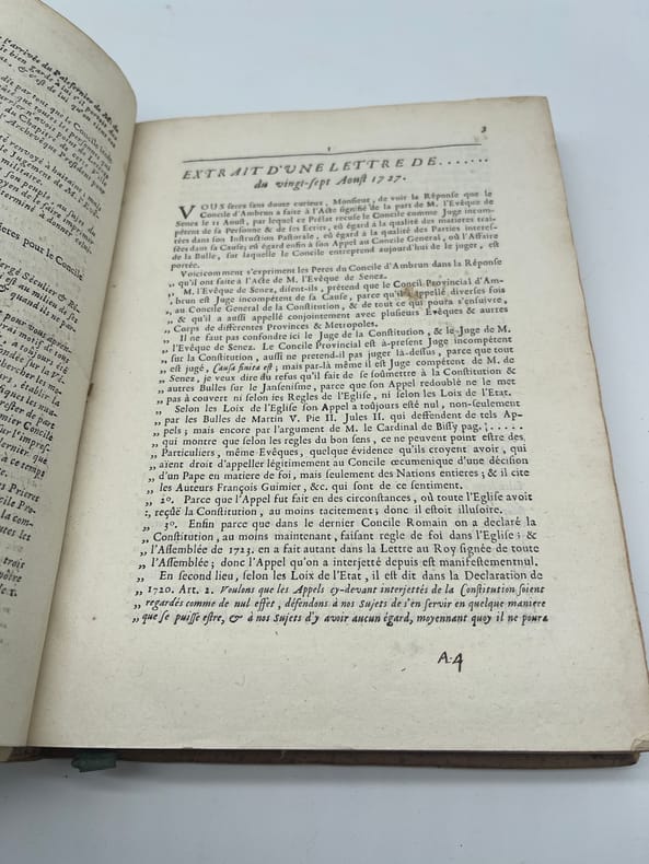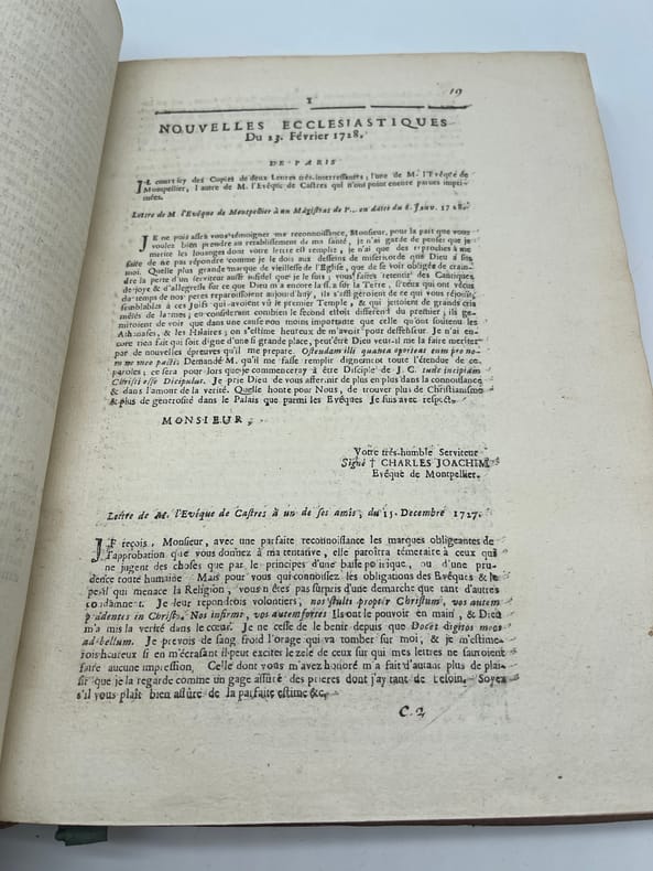 [Jansénisme] Nouvelles ecclésiastiques ou mémoires pour servir à l'histoire de la Constitution Unigenitus pour l'année M.DCC.XXVIII. Paris, s.n., 1728. In-4, environ 370p, paginations diverses. Année 1728 complète, commençant le 23 février 1728, avec des formats légèrement différents (certains numéros sont remargés à l'époque) et similaire à l'exemplaire de la BnF (numérisé sur gallica). Toutefois le volume débute par 5 feuilles « extrait d'une lettre de. » datées d'août à octobre 1727 (9 feuillets). On voit la trace de deux feuillets retirés (un autre extrait) et un exemplaire de « l'extrait d'une lettre d'Ambrun du 11 août 1727 » a été ajouté (volant). A la fin du volume se trouvent diverses pièces : « Supplément aux recueils des ordres émanés de la cour », un « avis de l'éditeur », une « ordonnance de Monseigneur l'évêque d'Auxerre » et une « très humble remontrance de M. de Montempuis au R.P. du Cerceau ». On remarquera que le volume, dont la reliure est d'époque, porte toutefois « tome II ». En effet, rapidement après la publication, un volume fut publié pour la période 1713-1728, considéré probablement comme le tome I. Provenance : Charles-Armand-René de La Trémoille (1708-1741), membre de l'Académie française, avec une grande vignette à ses armes en garde. TOUTEFOIS, nous supposons cette provenance purement fantaisiste, cela ressemblant à une vignette découpée (même si un second volume dans la même reliure porte la même vignette). Plein veau, dos à nerfs orné, pièces de titre et tomaison, tranches rouges. Coiffe supérieure arasées, étiquette sur le dos, cachet du petit séminaire de Caen p.100.