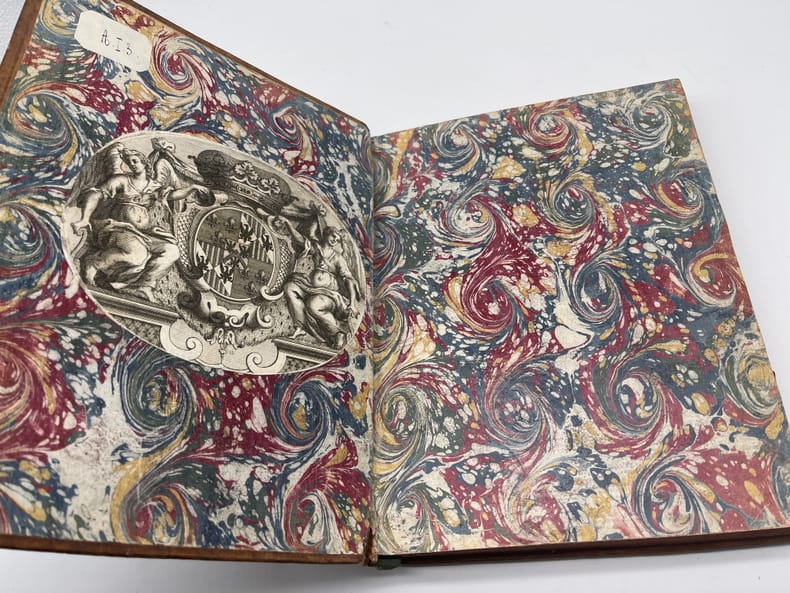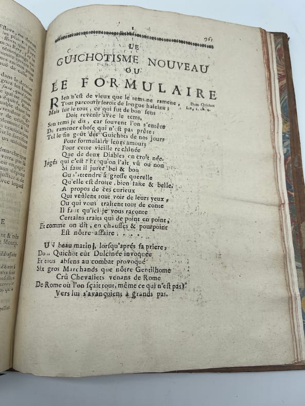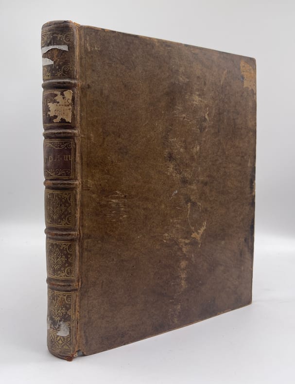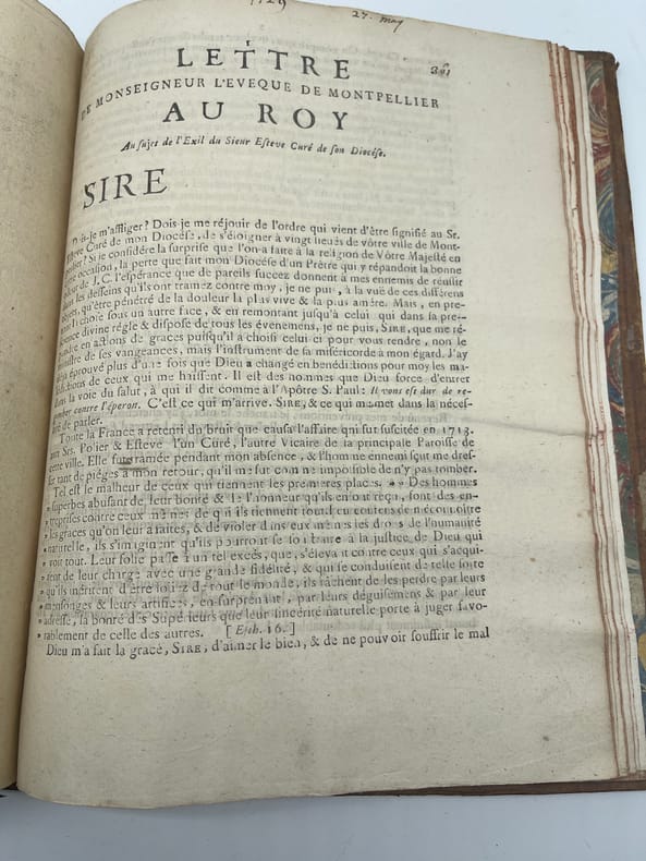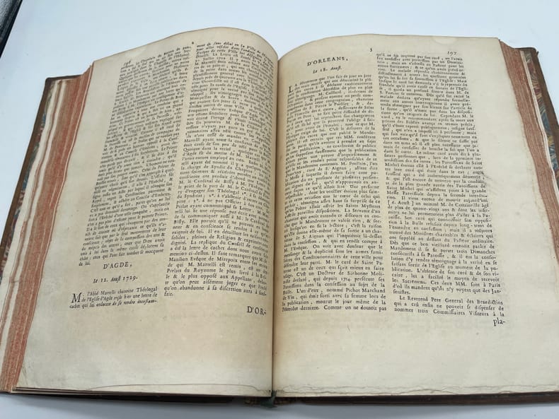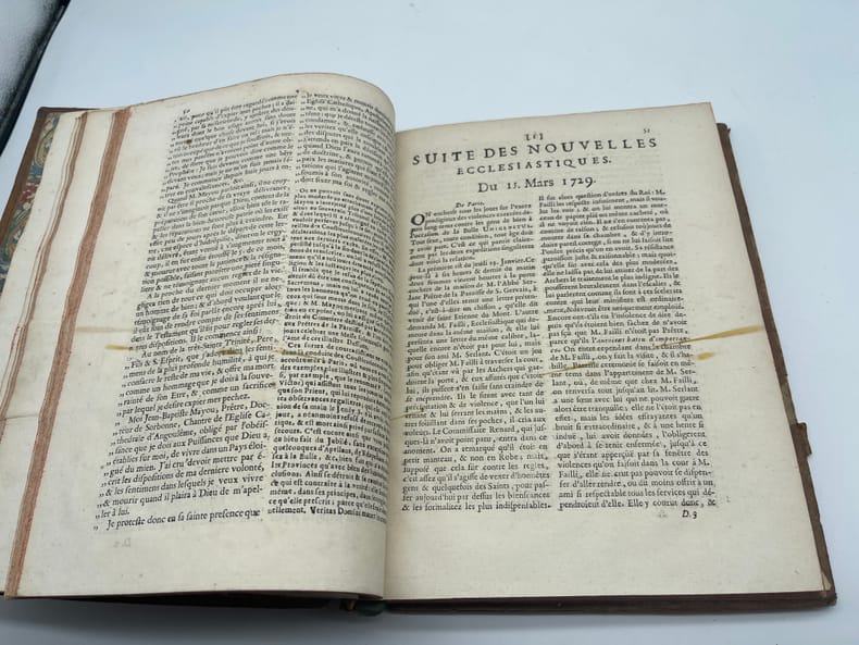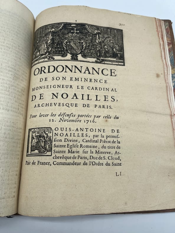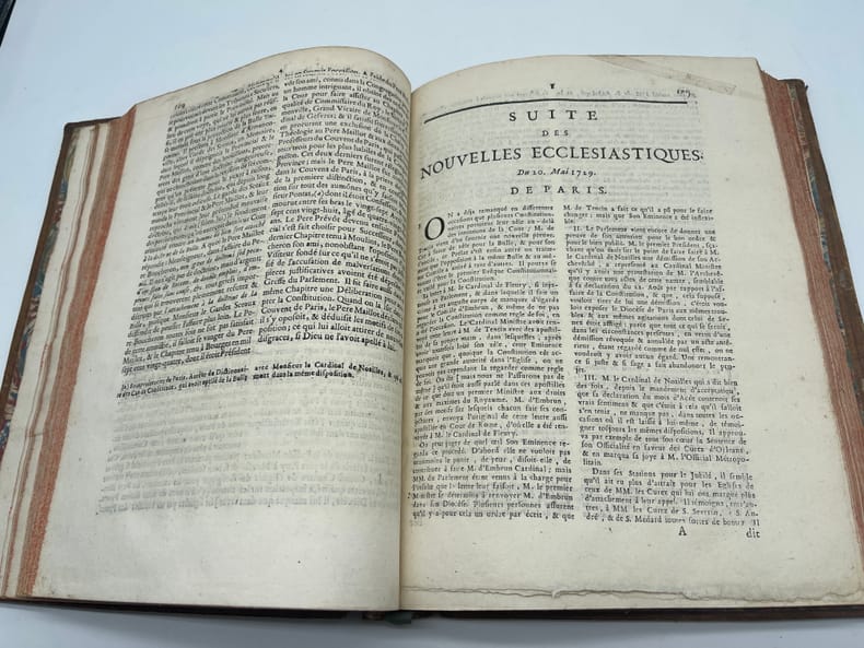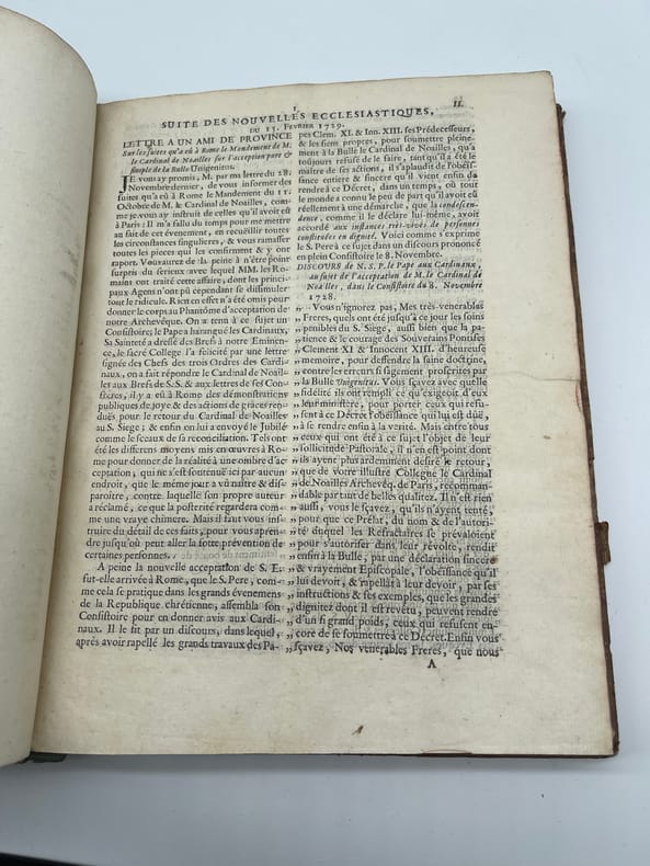 [Jansénisme] Nouvelles ecclésiastiques ou mémoires pour servir à l'histoire de la Constitution Unigenitus pour l'année M.DCC.XXIX. Paris, s.n., 1729. In-4, environ 345p, paginations diverses. Année 1729 complète, commençant le 15 février 1729, avec des formats légèrement différents (certains numéros sont remargés à l'époque). La numérotation manuscrite ajoutée à l'époque commence à la page 11, comme si le commanditaire de la reliure pensait qu'il manquait des numéros. Toutefois, l'exemplaire est similaire à celui de la BnF, ce qui nous fait dire que l'année est bien complète ainsi. A partir de la page 325 de notre exemplaire, plusieurs corrections manuscrites, similaires là-aussi avec celles de l'exemplaire de la BnF. A la fin du volume se trouvent diverses pièces : « Ordonnance de son éminence Monseigneur le Cardinal de Noailles » du 12 novembre 1716 [publié en 1729 par Delespine], « Lettre de Monseigneur l'Eveque de Montpellier au Roy au sujet de l'exil du sieur Esteve » et « Le Guichotisme nouveau ou le formulaire » [qui aurait été publié en 1727, un feuillet déchiré et réparé à l'époque]. On remarquera que le volume de cette deuxième année, dont la reliure est d'époque, porte toutefois « tome III ». En effet, rapidement après la publication, un volume fut publié pour la période 1713-1728, considéré probablement comme le tome I. Provenance : Charles-Armand-René de La Trémoille (1708-1741), membre de l'Académie française, avec une grande vignette à ses armes en garde. TOUTEFOIS, nous supposons cette provenance purement fantaisiste, cela ressemblant à une vignette découpée (même si un second volume dans la même reliure porte la même vignette). Plein veau, dos à nerfs orné, pièces de titre et tomaison, tranches rouges. Accroc en pied d'un mors, manque sur une coupe, cachet du petit séminaire de Caen.