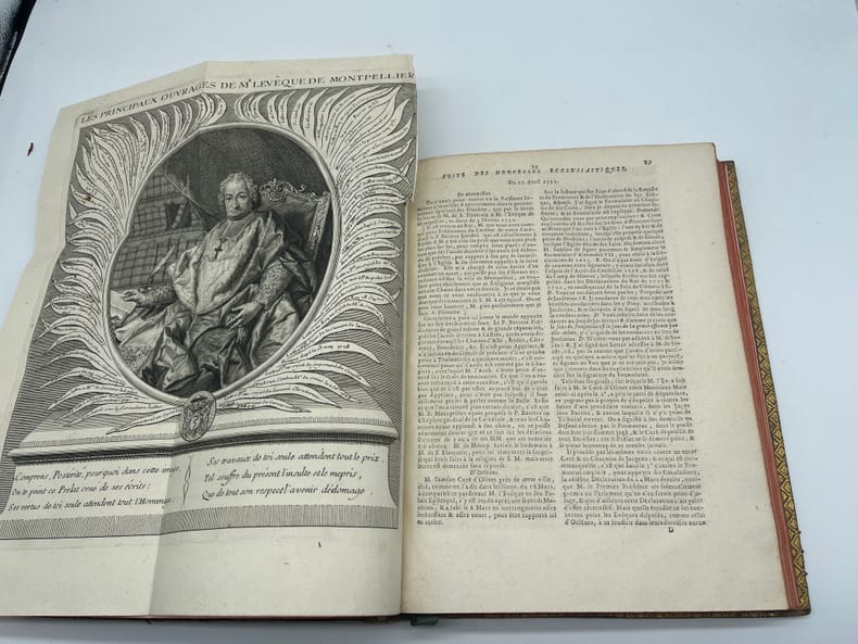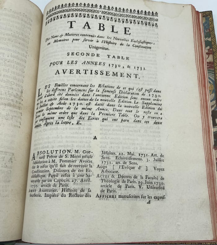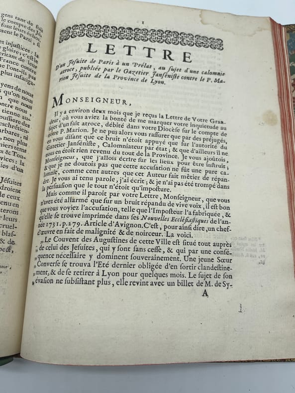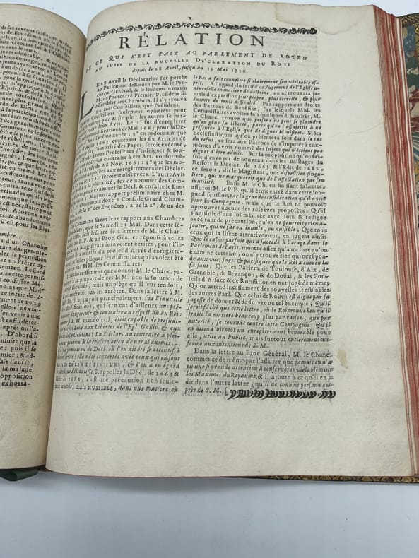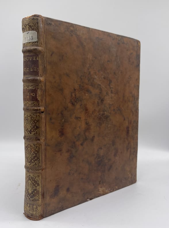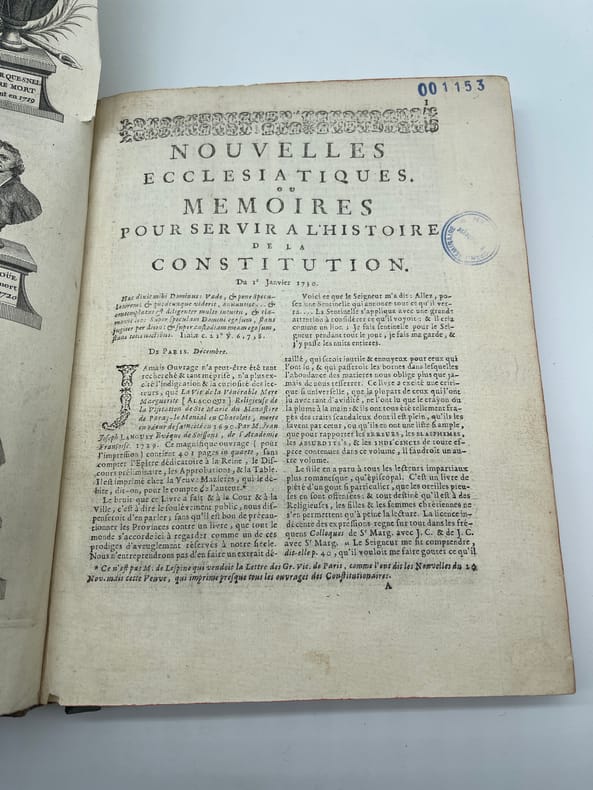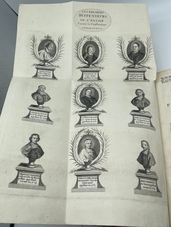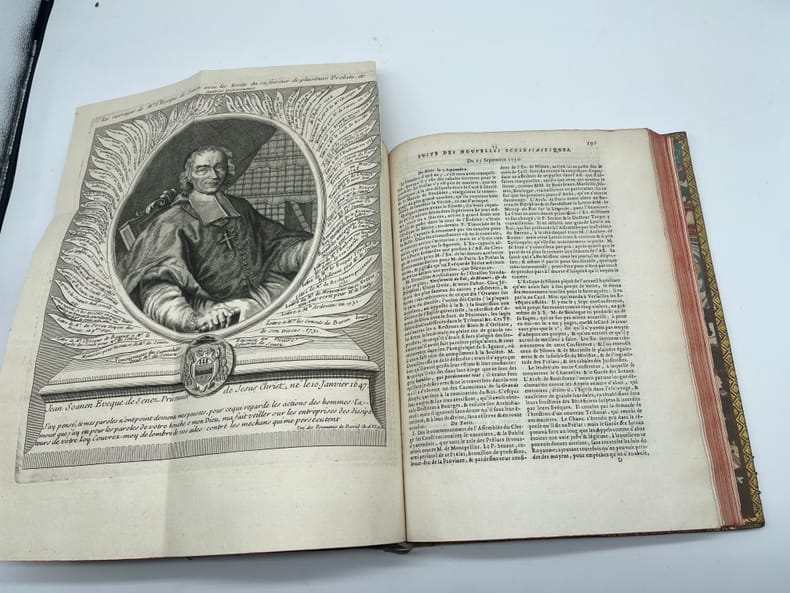 [Jansénisme] Nouvelles ecclésiastiques ou mémoires pour servir à l'histoire de la Constitution Unigenitus pour l'année M.DCC.XXX. Paris, s.n., 1730. In-4, environ 353p, paginations diverses. Année 1730 complète, truffé de 3 belles gravures au format in-folio et donc pliées : « Les premiers deffenseurs de l'Eglise contre la Constitution Unigenitus » (p.1, portraits de 9 appelants, cartouche de titre ajouté, collé en tête) ; un portrait de Charles-Joachim Colbert de Croissy (1667-1738) entouré d'une liste de ses oeuvres (p.83) ; un portrait de Jean Soanen (1647-1740) entouré lui aussi de la liste de ses oeuvres (p.195). Après les 258p de l'année (numérotées à l'encre) se trouvent différents textes : « relation de ce qui s'est passé au parlement de Rouen » du 28 avril au 19 mai 1730 ; « Lettre du père Chamillart jésuite au sujet du bruit qui avait couru de sa mort. » ; « Lettre d'un jésuite de Paris à un prélat au sujet d'une calomnie atroce. » (Paris, Herault, 30 mars 1732) ; « déclaration du père Tournemine jésuite sur des écrits supposés. » (Paris, Herault, 19 mars 1732) ; « Lettre au révérend père de Tournemine jésuite. » ; « Mandement de Monseigneur l'archevêque de Paris portant condamnation de plusieurs libelles qui ont pour titre Nouvelles ecclésiastiques » (Paris, P Simon, 1732) et une table pour les années 1730 et 1731. Plein veau, dos à nerfs orné, pièces de titre, tranches rouges. Petits défauts usuels, accroc à la coiffe supérieure, petite mouillure claire en tête (marginale).