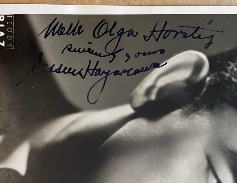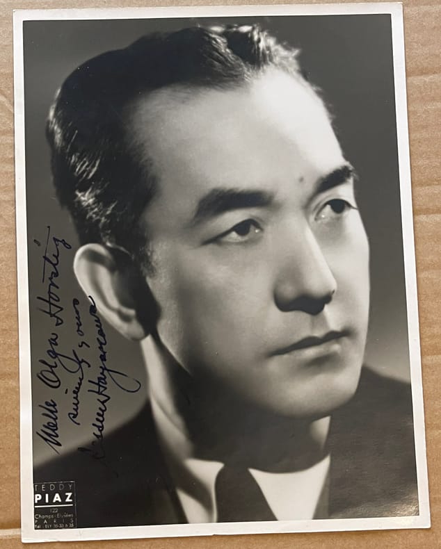 Sessue Hayakawa (1889-1973), acteur japonais, producteur de cinéma, réalisateur, mythique acteur du film Le Pont de la rivière Kwaï [The Bridge on the River Kwai]. Photographie originale signée, sd [ca.1925], 238*179mm. Belle dédicace à Olga Horstig-Primus (1912-2004), agent artistique et photographe : « Melle Olga Horstig / sincerely yours / Sessue Hayakawa ». Belle photographie de Teddy Piaz, photographe parisien, prise sans nul doute entre 1922 et 1931, quand il est en Europe. La dédicace est avant 1945 car elle mentionne encore « mademoiselle » Olga Horstig qui était mariée en 1945 (nous n'avons pas trouvé la date du mariage). Très belle photographie, très bien conservée. [393]