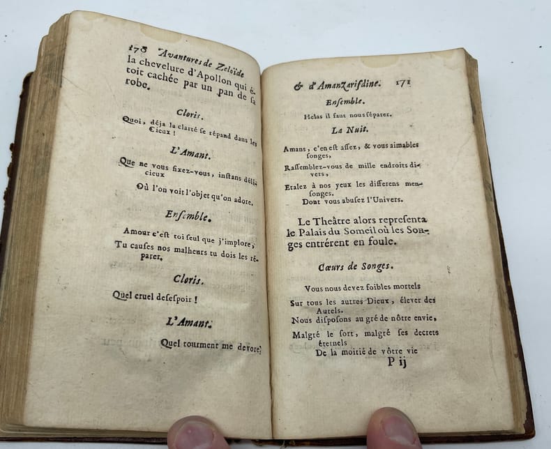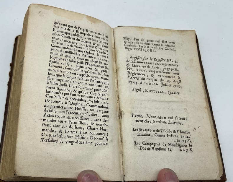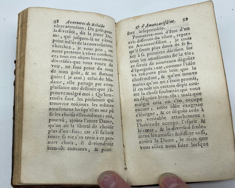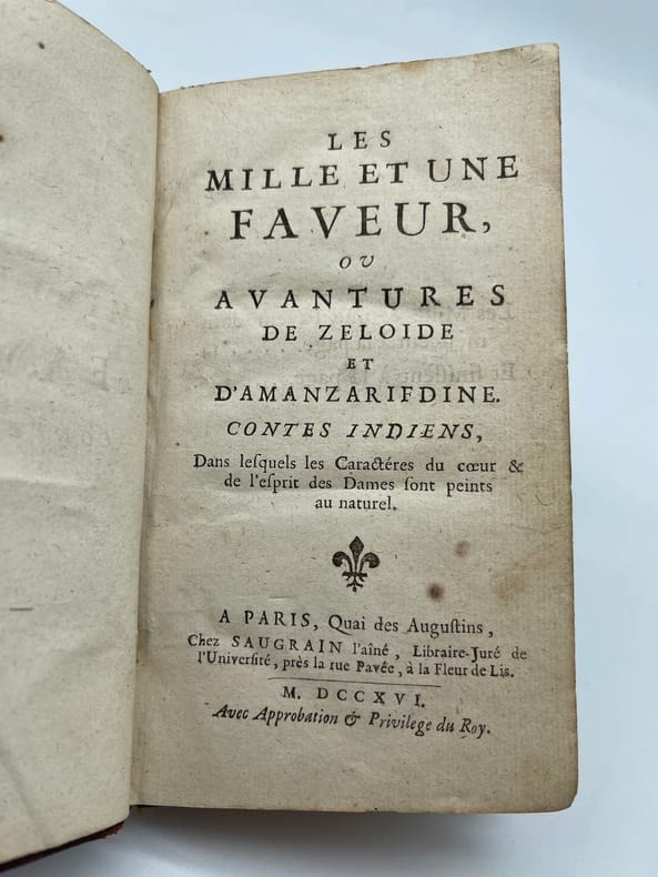 [Mille et une nuits] François-Augustin de Paradis de Moncrif, [Mille et une nuits] Les mille et une Faveur, ou Avantures de Zéloïde et d'Amanzarifdine. Contes indiens, dans lesquels les caractères du coeur & de l'esprit des Dames sont peints au naturel. Paris, Saugrain l'aîné, 1716. In-12, [10]-251-[5]p. Edition originale, troisième émission, du premier livre de Moncrif. Seule la page de titre a été changée. L'édition originale de première émission (Paris, Saugrain, 1715) portait pour titre « Avantures de Zéloïde et d'Amanzarifdine, contes indiens ». Une seconde émission de cette édition originale (Paris, Saugrain, 1716) ne se différencie que par l'année. Notre émission, la troisième, a donc une nouvelle page de titre, cherchant à profiter du succès des Mille et une nuit d'Antoine Galland (1646-1715) alors en cours de publication (les derniers volumes paraissent en 1717). Le thème se rapproche évidemment de celui des Mille et une nuit. Ouvrage rare dans ces trois émissions, quelques exemplaires conservés en France, toutes émissions confondus. Il y a toutefois une seule différence : notre émission porte un faux-titre, absent des deux autres émissions (qui ont donc pour collation [8]-251-[5]p au lieu de [10]-251-[5]p). Ce faux titre porte d'ailleurs « Les mille et une faveur. Contes indiens ». On notera aussi une table erronée ajoutée au dos du titre (absente des autres éditions). L'ouvrage fut traduit en anglais dès 1718 (Indian Tales of Zeloïde and Amanzarifdine). Pleine basane, dos à nerfs orné, pièce de titre, tranches marbrées. Manques sur le dos, aux coiffes et en haut du dos, coins usés. Bon exemplaire, très très rare.