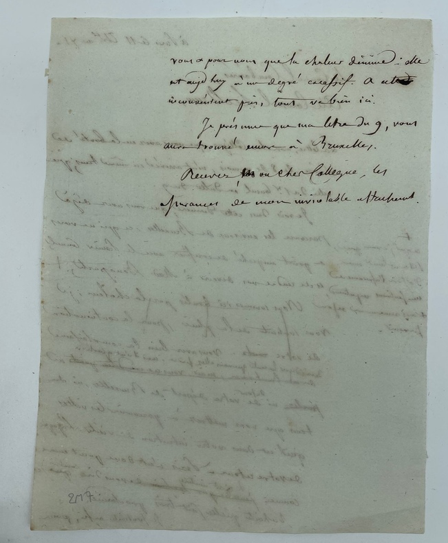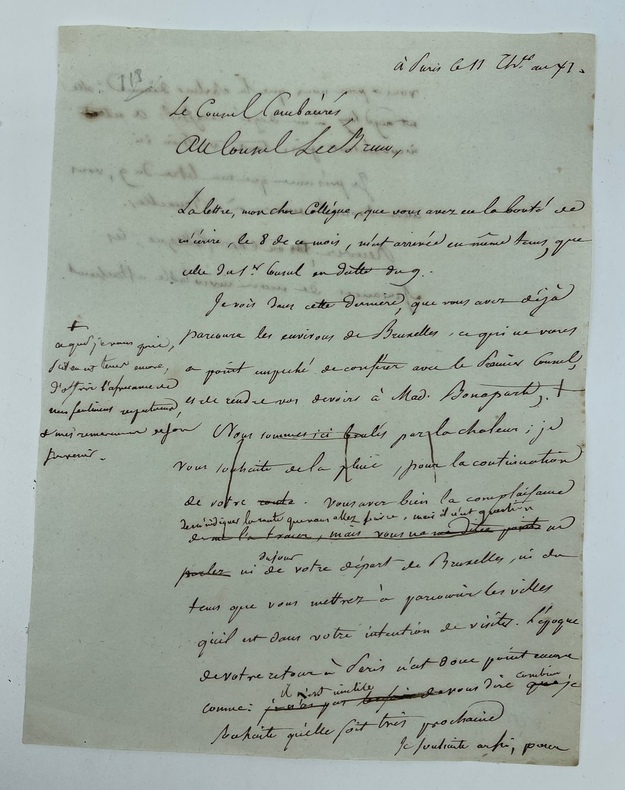 Jean-Jacques-Régis de Cambacérès (1753-1824), homme d'état, deuxième consul, archichancelier de l'Empire, membre de l'Académie française. Manuscrit autographe, Paris, 11 thermidor an XI [30 juillet 1803], 1pœ in-4. Très important brouillon d'une lettre du deuxième consul au troisième consul, Charles-François Lebrun (1739-1824) - le premier consul étant Napoléon. Les parties entre crochets sont barrées par Cambacérès. La lettre mentionne Napoléon et son épouse, Joséphine de Beauharnais. « Le Consul Cambacérès, au Consul Le Brun, La Lettre, mon cher Collègue, que vous avez eu la bonté de m'écrire, le 8 de ce mois, m'est arrivée en même temps que celle du 1er Consul en date du 9. Je vois dans cette dernière que vous avez déjà parcouru les environs de Bruxelles, ce qui ne vous a point empêché de conférer avec le Premier Consul, et de rendre vos devoirs à Mad. Bonaparte, à qui je vous prie, s'il est temps encore, d'offrir l'assurance de mes sentiments respectueux, et mes remerciements de son souvenir. [Nous sommes ici brûlés par la chaleur ; je vous souhaite de la pluie, pour la continuation de votre route.] Vous avez la complaisance [de me la tracer, mais ne me dites point] de m'indiquer la route que vous allez suivre, mais il n'est question ni du jour de votre départ de Bruxelles, ni du temps que vous mettrez à parcourir les villes qu'il est dans votre intention de visiter. L'époque de votre retour à Paris n'est donc point encore connue : [je n'ai pas le soin] il m'est inutile de vous dire combien je souhaite qu'elle soit très prochaine. Je souhaite aussi, pour vous & pour nous que la chaleur diminue : elle est aujourd'hui à un degré excessif. À cet inconvénient excessif près, tout va bien ici. Je présume que ma lettre du 9 vous aura trouvé encore à Bruxelles. Recevez, mon cher Collègue, les assurances de mon inviolable attachement ». Napoléon Bonaparte est alors en voyage d'inspection dans le Nord de la France et en Belgique, accompagné de Lebrun. Aussi étonnant que cela puisse paraître, les papiers de Cambacérès ne sont pas revendicables. Comme le rappelle Thierry Bodin, en préambule du catalogue de la vente des lettres de Napoléon à Cambacérès (Paris, Aguttes, 19 octobre 2022), les papiers saisis par l'état à la mort de Cambacérès sont rendus en partie à la famille après un procès de 4 ans. Les documents de ses archives qui circulent font donc partie de cette restitution. Beau document [93]