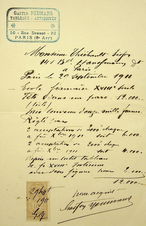 Gaston Neumans (1873-1948), marchand de tableaux, expert, collectionneur. P.A.S., Paris, 29 septembre 1911, 1p in-8. Facture pour l'achat d'un tableau XVIIIe, « Fête dans un parc » par François Thiébault-Sisson (1856-1944), critique d'art, pour la somme de 12000 francs. Le détail du paiement indique que Thiébault-Sisson a payé avec un autre tableau XVIIIe. Intéressant petit document.