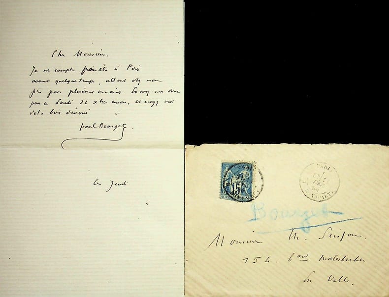 Paul Bourget (1852-1935), écrivain, membre de l'Académie française. L.A.S. + enveloppe, 11 décembre 1884, 1/2p in-8. Au critique d'art François Thiébault-Sisson (1856-1944). « Cher Monsieur, Je ne compte pas être à Paris avant quelque temps, allant chez mon père pour plusieurs semaines. Excusez-moi donc pour ce lundi 22 décembre encore et croyez-moi votre bien dévoué Paul Bourget ». [93]