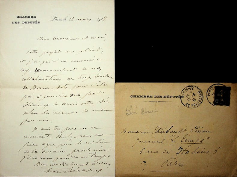 Léon Bérard (1876-1960), homme politique, ministre, membre de l'Académie française. L.A.S. + enveloppe, 12 mars 1918, 1p in-8. Au critique d'art François Thiébault-Sisson (1856-1944). Il est prêt à l'aider et lui propose de lui donner un rendez-vous la semaine prochaine au journal Le Temps où Thiébault-Sisson travaille. [93]