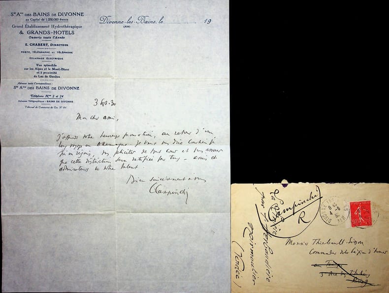 César Campinchi (1882-1941), avocat, homme politique, Garde des Sceaux, ministre de la Justice. L.A.S. + enveloppe, 3 septembre 1930, 1/2p in-4. Au critique d'art François Thiébault-Sisson (1856-1944). Il le félicite pour sa récente promotion dans la Légion d'Honneur. Il est en effet promu commandeur le 12 août. [93]