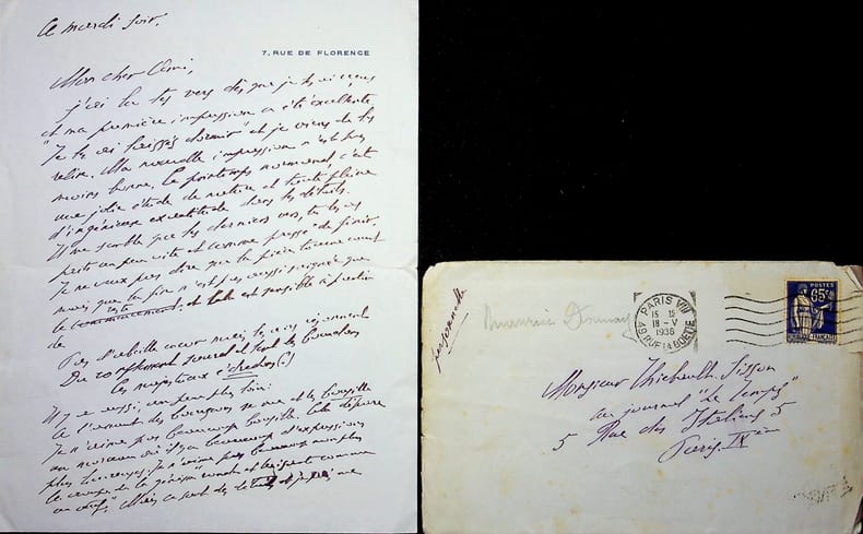 Maurice Donnay (1859-1945), poète, écrivain. L.A.S. + enveloppe, 6 juillet 1938, 1p in-8. Au critique d'art François Thiébault-Sisson (1856-1944). Jolie lettre amicale, il mentionne la mort de sa soeur et les vers de Thiébault-Sisson qu'il va lire. [93]