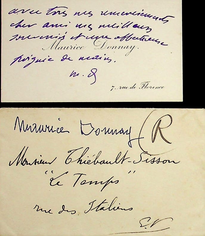 Maurice Donnay (1859-1945), poète, écrivain. C.A.S. (+ enveloppe probablement d'un autre courrier), sd, 4 lignes. Au critique d'art François Thiébault-Sisson (1856-1944). « Avec tous mes remerciements cher ami, mes meilleurs souvenirs et une affectueuse poignée de mains. M.D. ». [93]