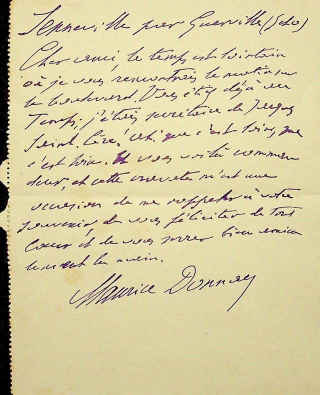 Maurice Donnay (1859-1945), poète, écrivain. L.A.S., 15 août 1930, 1p in-12. Au critique d'art François Thiébault-Sisson (1856-1944). Il le félicite pour sa promotion de commandeur de la Légion d'Honneur, tout en se rappelant leurs rencontres 30 ans plus tôt, quand Donnay était secrétaire de Jacques Saint-Cère. [93]