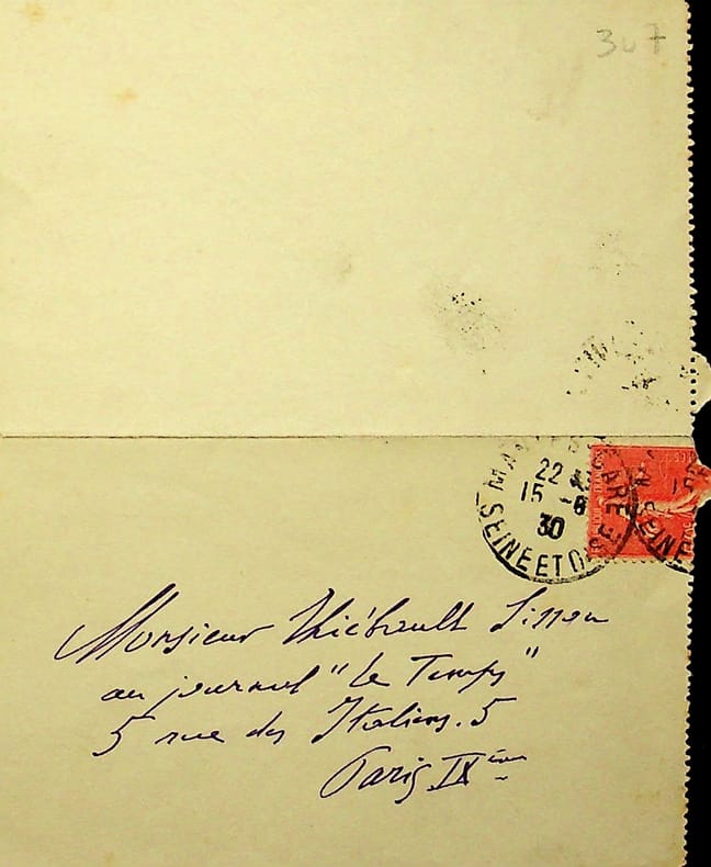 Léon Bérard (1876-1960), homme politique, ministre, membre de l'Académie française. L.A.S. + enveloppe, 12 mars 1918, 1p in-8. Au critique d'art François Thiébault-Sisson (1856-1944). Il est prêt à l'aider et lui propose de lui donner un rendez-vous la semaine prochaine au journal Le Temps où Thiébault-Sisson travaille. [93]