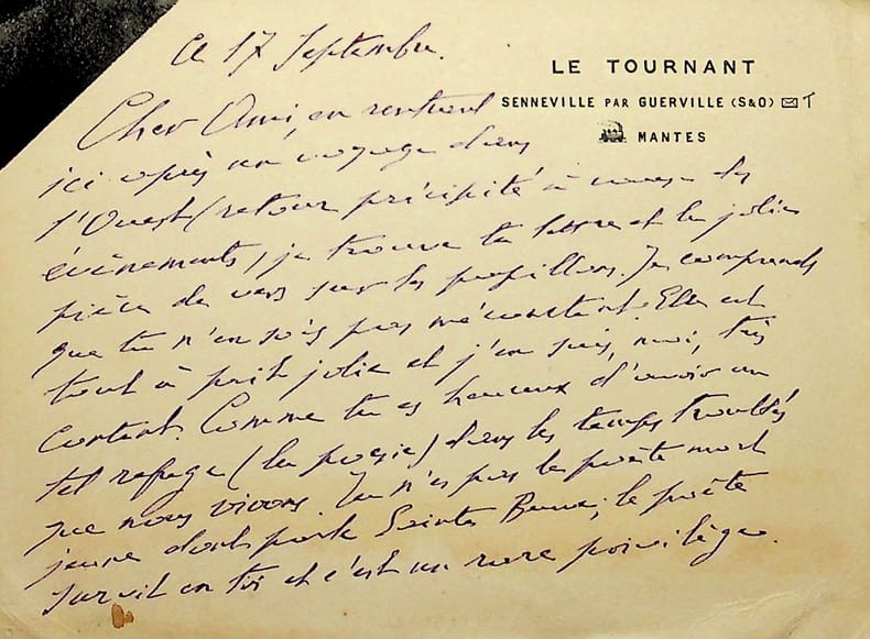 Maurice Donnay (1859-1945), poète, écrivain. L.A.S., 15 septembre [1939], 2p in-8. Au critique d'art François Thiébault-Sisson (1856-1944). Belle lettre amicale, quand il trouve des vers de Thiébault-Sisson à son retour de voyage parlant de « refuge dans les temps troublés » qu'ils vivent. [93]