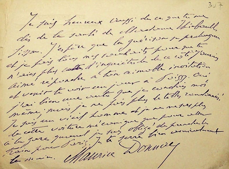 Maurice Donnay (1859-1945), poète, écrivain. L.A.S. + enveloppe, 6 juillet 1938, 1p in-8. Au critique d'art François Thiébault-Sisson (1856-1944). Jolie lettre amicale, il mentionne la mort de sa soeur et les vers de Thiébault-Sisson qu'il va lire. [93]