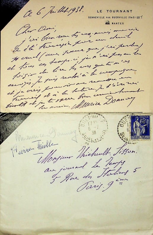 Maurice Donnay (1859-1945), poète, écrivain. L.A.S. + enveloppe, 6 juillet 1938, 1p in-8. Au critique d'art François Thiébault-Sisson (1856-1944). Jolie lettre amicale, il mentionne la mort de sa soeur et les vers de Thiébault-Sisson qu'il va lire. [93]