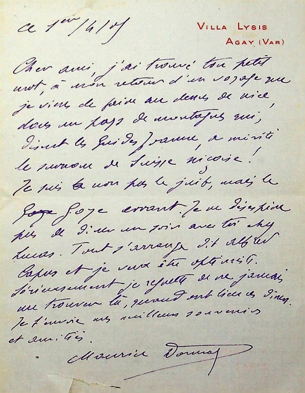 Maurice Donnay (1859-1945), poète, écrivain. L.A.S., 1 avril 1905, 1p in-12. Au critique d'art François Thiébault-Sisson (1856-1944). Jolie lettre amicale au retour d'un voyage, avec une amusante phrase : « je suis non pas le juif mais le goye errant ». [93]