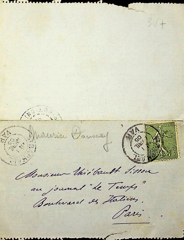 Maurice Donnay (1859-1945), poète, écrivain. L.A.S. + enveloppe, 6 juillet 1938, 1p in-8. Au critique d'art François Thiébault-Sisson (1856-1944). Jolie lettre amicale, il mentionne la mort de sa soeur et les vers de Thiébault-Sisson qu'il va lire. [93]