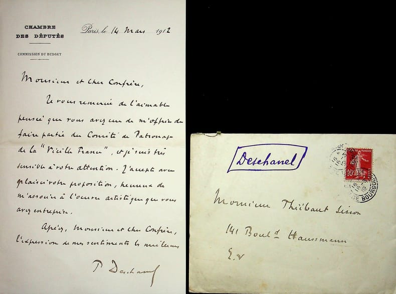 Paul Deschanel (1855-1922), écrivain, homme politique, président de la république. L.A.S. + enveloppe, 14 mars 1912, 1p in-4. Au critique d'art François Thiébault-Sisson (1856-1944). Il est heureux de faire partie du « comité de patronage de la Vieille France » et l'en remercie. [93]