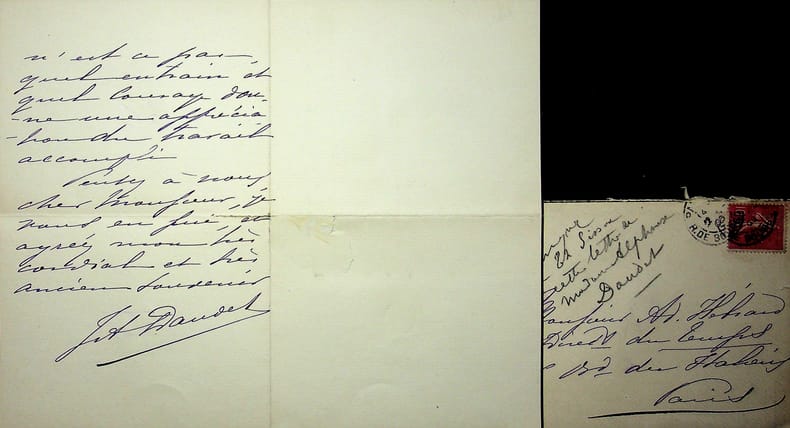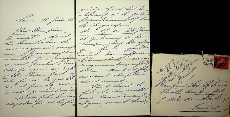 Julia Daudet (1844-1940), poétesse, écrivain, épouse d'Alphonse Daudet. L.A.S. + enveloppe, 11 juin 1906, 3p in-8. Au directeur du Temps, Adrien Hébrard (1833-1914) qui a transmis cette lettre au critique d'art François Thiébault-Sisson (1856-1944). Elle demande que le journal Le Temps parle de la première exposition des tableaux de son fils Lucien Daudet. Lucien n'eut pas aucun succès et ne semble pas avoir fait d'autre exposition personnelle. Il participa toutefois à deux salons en 1907. Cachet de cire JD au dos de l'enveloppe. Déchirure centrale. Belle lettre. [93]