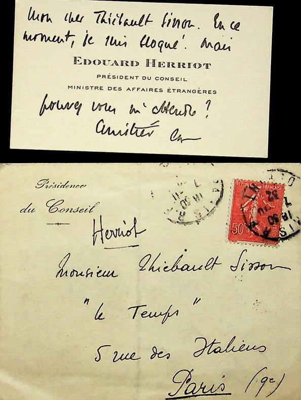 Edouard Herriot (1872-1957), homme politique, membre de l'Académie française. C.A.S. + enveloppe, 7 octobre 1932, 3 lignes. Au critique d'art François Thiébault-Sisson (1856-1944). « Mon cher Thiébault Sisson, en ce moment, je suis bloqué. Mais pouvez-vous m'attendre ? Amitiés EH ». [93]