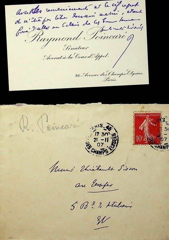 Raymond Poincaré (1860-1934), homme politique, président de la république. C.A., sd, 3 lignes. Au critique d'art François Thiébault-Sisson (1856-1944). « avec ses remerciements et le vif regret de n'être pas libre demain matin, étant forcé d'aller au palais de très bonne heure. Sentiments dévoués » . [93]