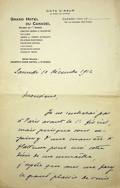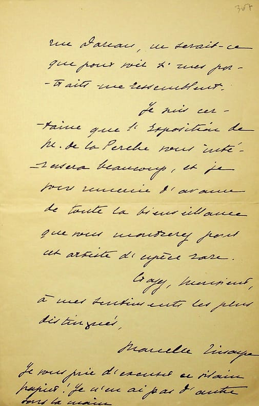 Marcelle Tinayre (1870-1948), écrivain. L.A.S., 10 décembre 1912, 2p in-8. Au critique d'art François Thiébault-Sisson (1856-1944). Thiébault-Sisson souhaitant la rencontrer, elle lui propose de venir chez elle « ne serait-ce que pour voir si mes portraits me ressemblent ». Elle lui recommande aussi le peintre G. de la Perche qui fait une exposition du 17 janvier au 15 février à la galerie Georges Petit. Ce peintre, qui semble être un portraitiste, n'a pas laissé beaucoup de traces. [93]